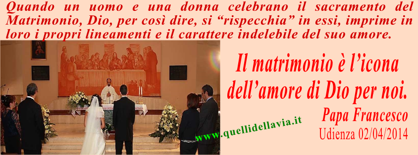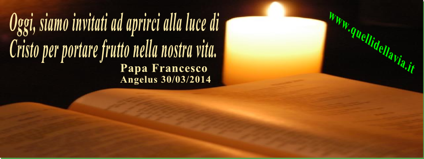 Angelus/Regina Cæli - Angelus, 30 marzo 2014 Udienza - 2 aprile 2014 Discorso - Agli aderenti al Movimento Apostolico Ciechi (MAC) e alla Piccola Missione per i Sordomuti (29 marzo 2014) Discorso - Ai partecipanti al Capitolo Generale della Società Salesiana di San Giovanni Bosco (Salesiani) (31 marzo 2014) Discorso - Ai Presuli della Conferenza Episcopale di Rwanda, in visita "ad Limina Apostolorum" (3 aprile 2014) MESSAGGIO - PER LA QUARESIMA 2014--------------------------------------------------------------- SEGNALATI IN FACEBOOK NELLA NOSTRA PAGINA SOCIALE "QUELLI DELLA VIA"Tweet 29/03/2014: